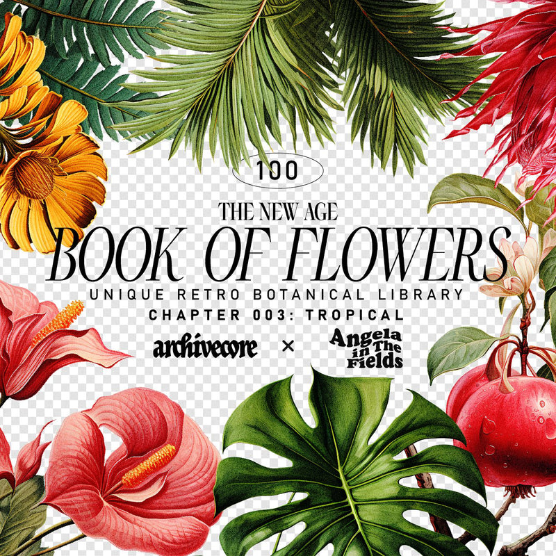 The BOOK OF FLOWERS 3 Tropical is a collection of 100 tropical-themed botanical illustrations, created in partnership with Archivecore. The images, which are in PNG format and range from 3000-3600 px in height, combine vintage aesthetics with modern technology, and are the result of both AI and human design efforts. This product is compatible with Photoshop, Affinity Photo, Procreate, Sketch, Figma, and Canva.