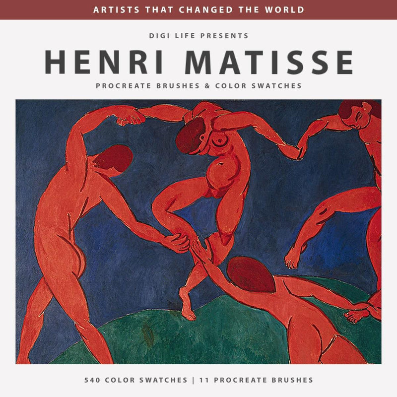 The Henri Matisse Procreate Kit includes 540 color swatches and 11 brushes inspired by Henri Matisse's paintings, designed for illustrators and graphic designers. It is compatible with Procreate and also provides a Spotify playlist link and 24/7 support.