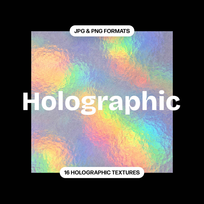 Holographic Textures includes a collection of 16 high-quality JPG and PNG textures, each measuring 2500x2500 pixels at 300 dpi. Compatible with various design software, these textures can be easily applied to a range of projects.