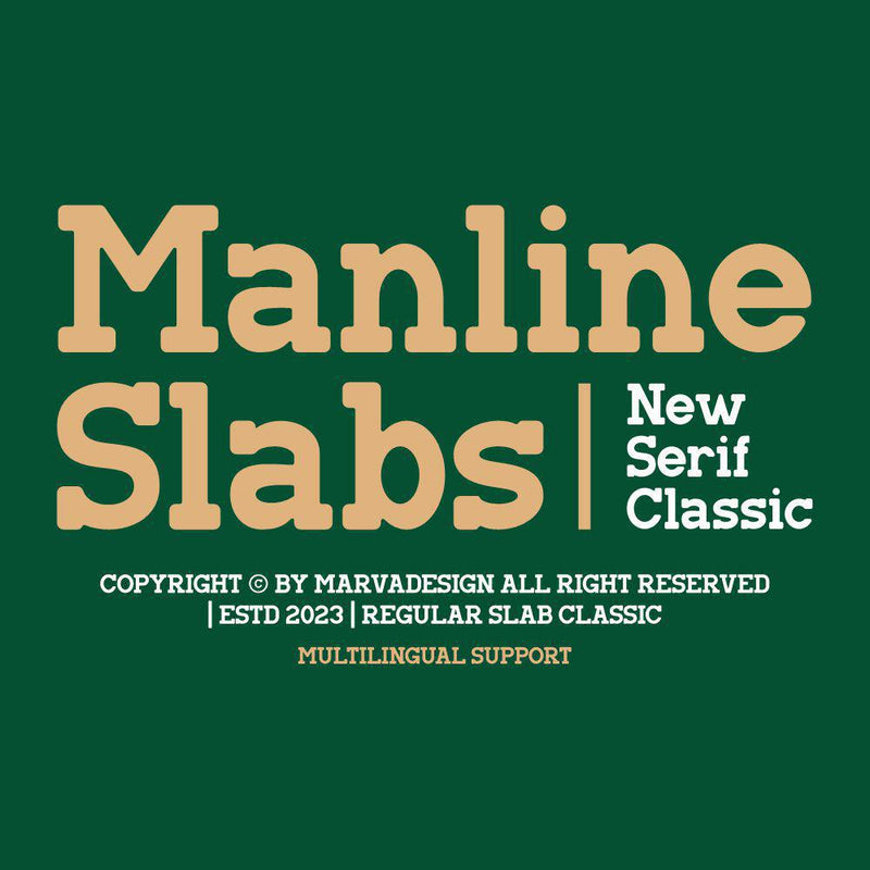 Manline is a bold slab serif typeface that features strong, blocky serifs and rounded edges, offering excellent readability with well-balanced letterforms. It includes a comprehensive set of uppercase and lowercase letters, numerals, punctuation, and special characters, providing multilingual support for a variety of design applications.