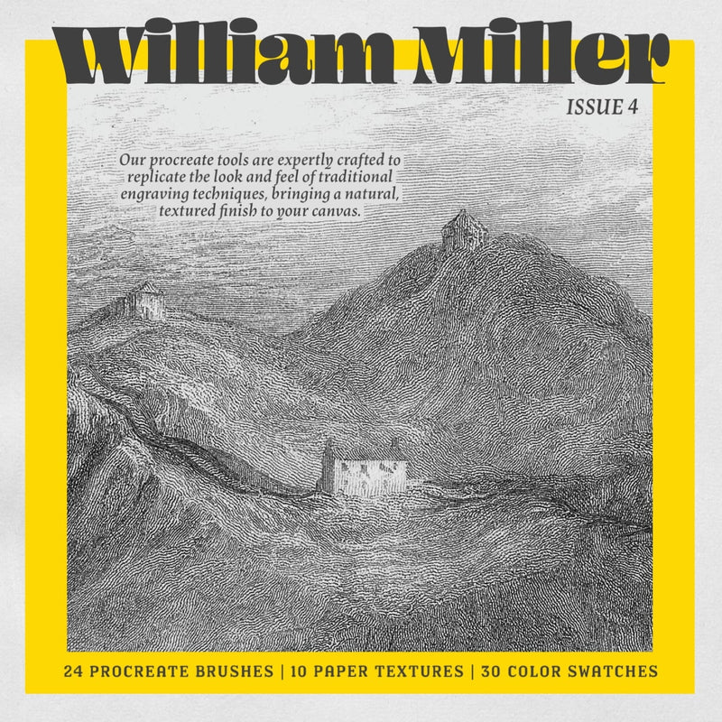 The William Miller Procreate Kit includes 24 Procreate brushes, 30 color swatches, and 10 high-resolution paper textures designed for engraving and sketching. Compatible with Procreate on iPad, this kit provides tools for etching, hatching, and shading, along with a Spotify playlist link for an immersive experience.