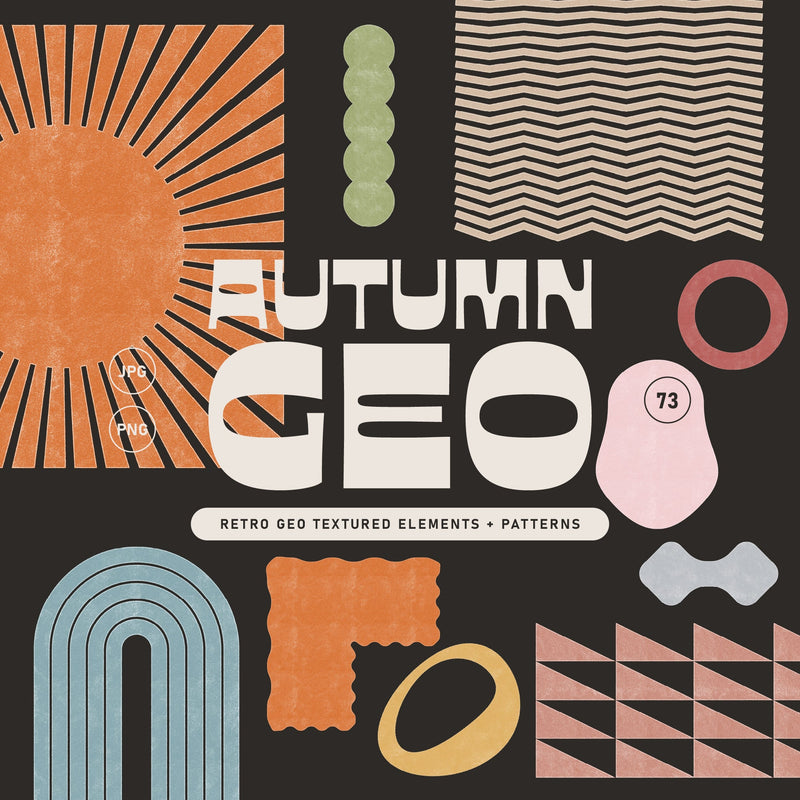 The 60+ Autumn Retro Geo Objects pack is a set of 63 textured objects and 10 bonus patterns compatible with Photoshop. It features subdued hues and softer tones, with a textured surface that adds a retro feel, ideal for social media templates and print projects.
