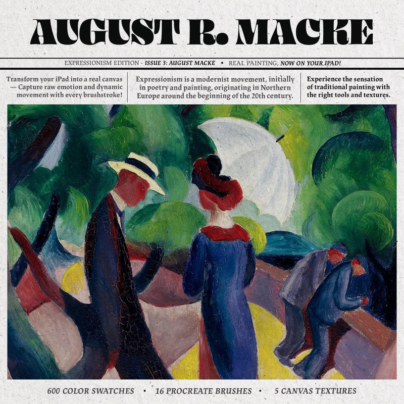 The August Macke Procreate Kit is a digital toolset designed for illustrators and graphic designers, inspired by the Expressionism movement. It includes 600 Procreate color swatches, 16 Procreate brushes, 5 canvas textures, and offers free support 24/7. This kit is compatible with the Procreate app for iPad and requires an Apple iPad and Apple Pencil for use.