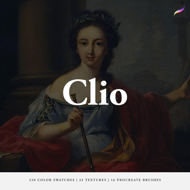 Clio's Procreate Kit includes a customizable Procreate file with 13 paper and 9 canvas textures, 16 realistic brushes (including pencils, inks, and sponge paints), and 330 color swatches. This kit is designed for Procreate users seeking a variety of textures and tools for their digital artwork.