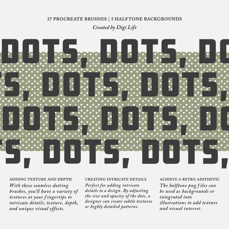The Dots, Dots, Dots Procreate Brushes package includes 27 Procreate brushes and 5 halftone paper textures, designed for creating intricate dot patterns and retro-inspired textures. Compatible with the Procreate app on iPad, these brushes are ideal for artists of all skill levels and come with 24/7 free support.