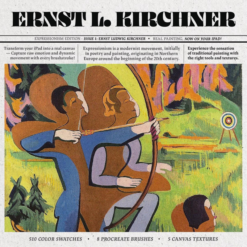 The Ernst Ludwig Kirchner Procreate Kit is a digital toolset designed for illustrators and graphic designers, offering a range of features inspired by the Expressionism art movement. The kit includes 510 Procreate color swatches, 8 Procreate brushes, 5 canvas textures, and provides 24/7 support, all compatible with the Procreate app for iPad.