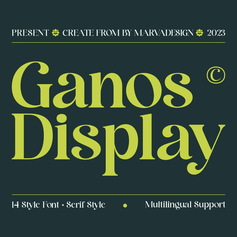 Ganos is a versatile serif display font family that includes styles such as Light, Regular, Medium, Semi Bold, Bold, and their corresponding Italics, as well as Extra Bold and Black styles. Its sophisticated design and comprehensive range of styles make it suitable for various creative projects.