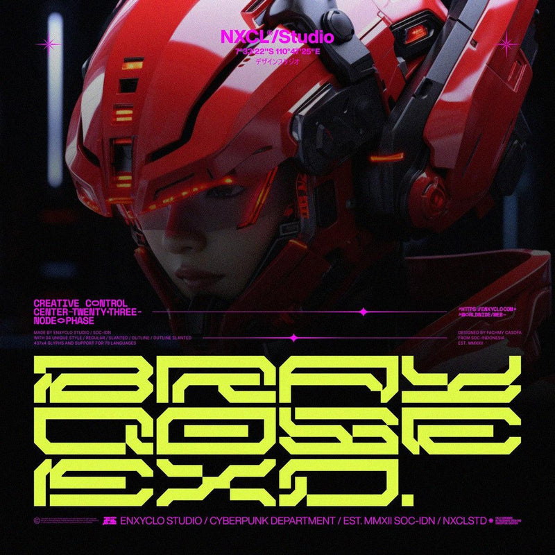 The NCL BRAYQOSE EXPANDED is a cyberpunk futuristic font that offers modern aesthetics. It comes in four styles: Regular, Slanted, Outline, and Outline Slanted, and includes 1748 Glyphs in total. The font supports True Type Font (TTF), Open Type Font (OTF), and Web Open Font Format (WOFF1 & WOFF2), and is compatible with 79 languages.
