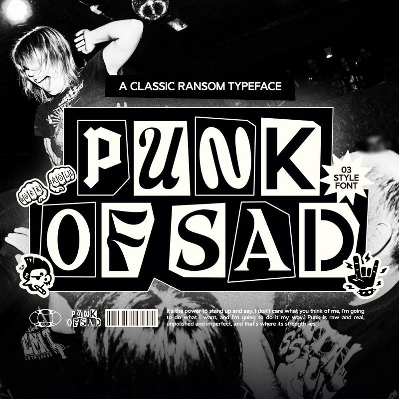 **Punk Of Sad** is a unique typeface that combines vintage ransom note aesthetics with a gritty edge, available in three styles: **Regular**, featuring rugged cut-out letterforms; **Line**, offering outlined characters for a lighter appearance; and **Dingbats Punk**, a collection of punk-inspired symbols and icons. This font provides designers with versatile options for creating bold and unconventional designs.