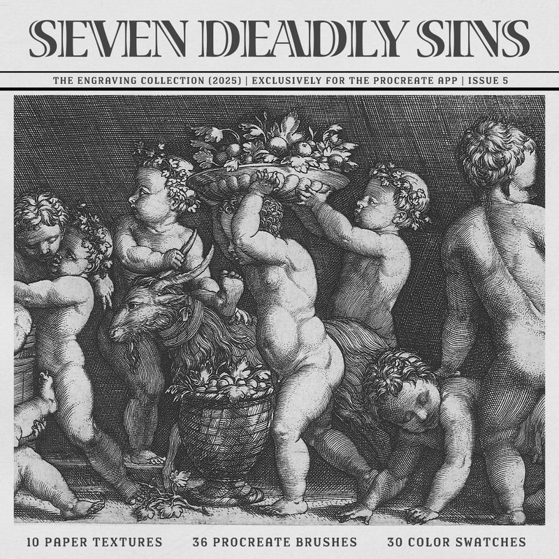 The Seven Deadly Sins Procreate Kit is designed for illustrators, printmakers, designers, and Procreate artists, featuring 30 color swatches, 36 Procreate brushes, and 10 high-resolution paper textures. This kit also includes a Spotify playlist link and 24/7 support, all compatible with Procreate for creating detailed line art and vintage illustration styles.