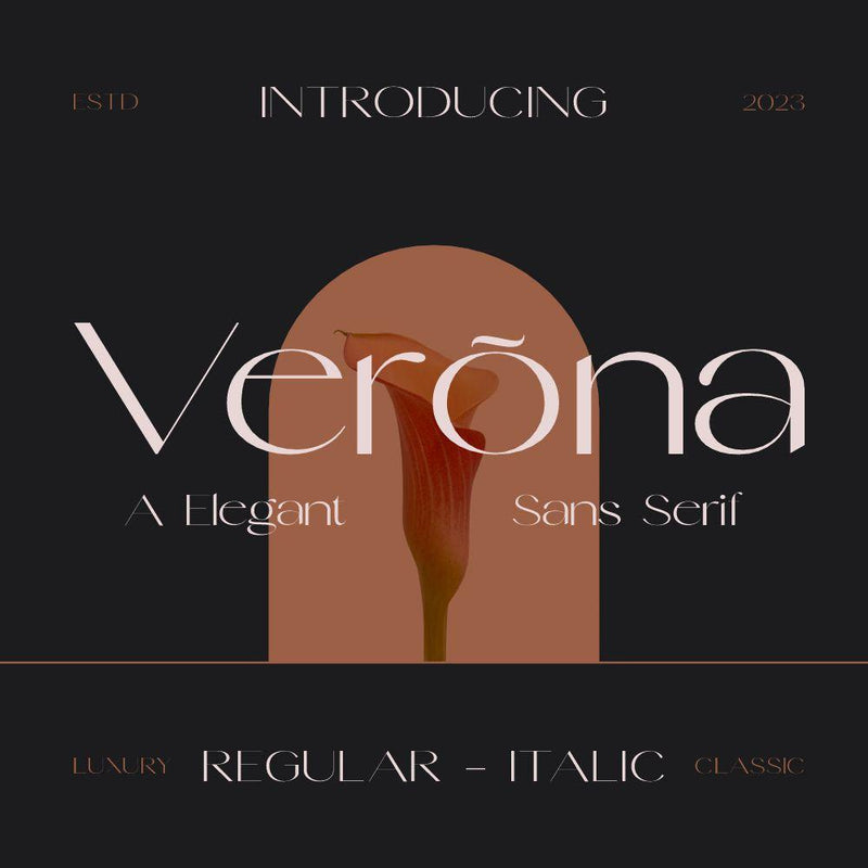 The Verona font is a sophisticated typeface offering two styles: Regular and Italic. It features an elegant minimalist design with high contrast, making it suitable for a range of applications from branding to editorial content.