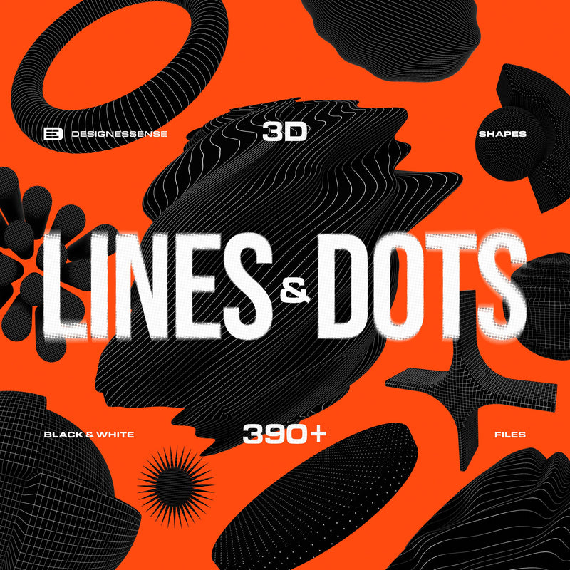 The 390+ Lines & Dots 3D Shapes is a digital collection of high-quality, unique abstract 3D shapes in lines, dots, and checkered styles. The set includes over 390 PNG files in two color versions (black and white), all in high resolution (5000 x 5000 px) with a transparent background. It is compatible with various design platforms such as Photoshop, Affinity Photo, Procreate, Sketch, Figma, and Canva.