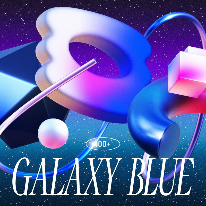 The 3D GALAXY BLUE Objects is a set of 200 3D rendered objects, half of which are textured and half non-textured, all on a transparent background PNG. The set also includes bonus sparkles on a transparent background PNG. The graphics are compatible with Photoshop, After Effects, Affinity Photo, Procreate, and Canva.