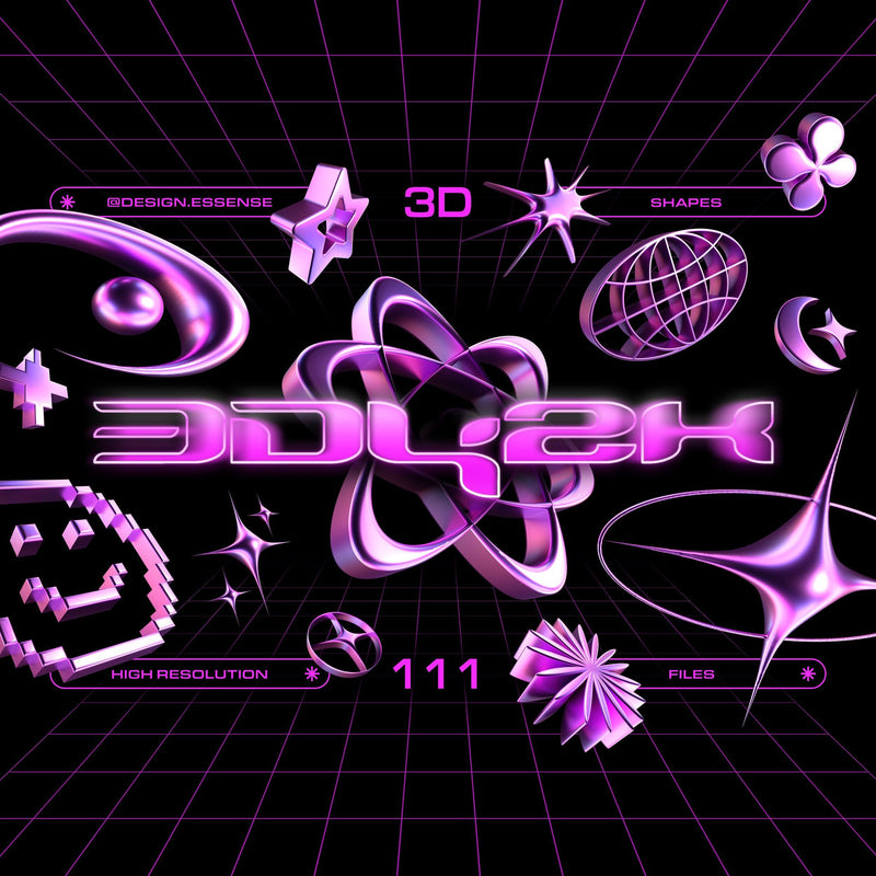 The 3D Y2K Objects Collection is a digital product featuring 111 high-quality, unique Y2K-inspired 3D shapes. The collection includes PNG files with high resolution (5000 x 5000 px) and transparent backgrounds, viewable from 3 different camera angles. Compatible with Photoshop, Affinity Photo, Procreate, Sketch, Figma, and Canva.