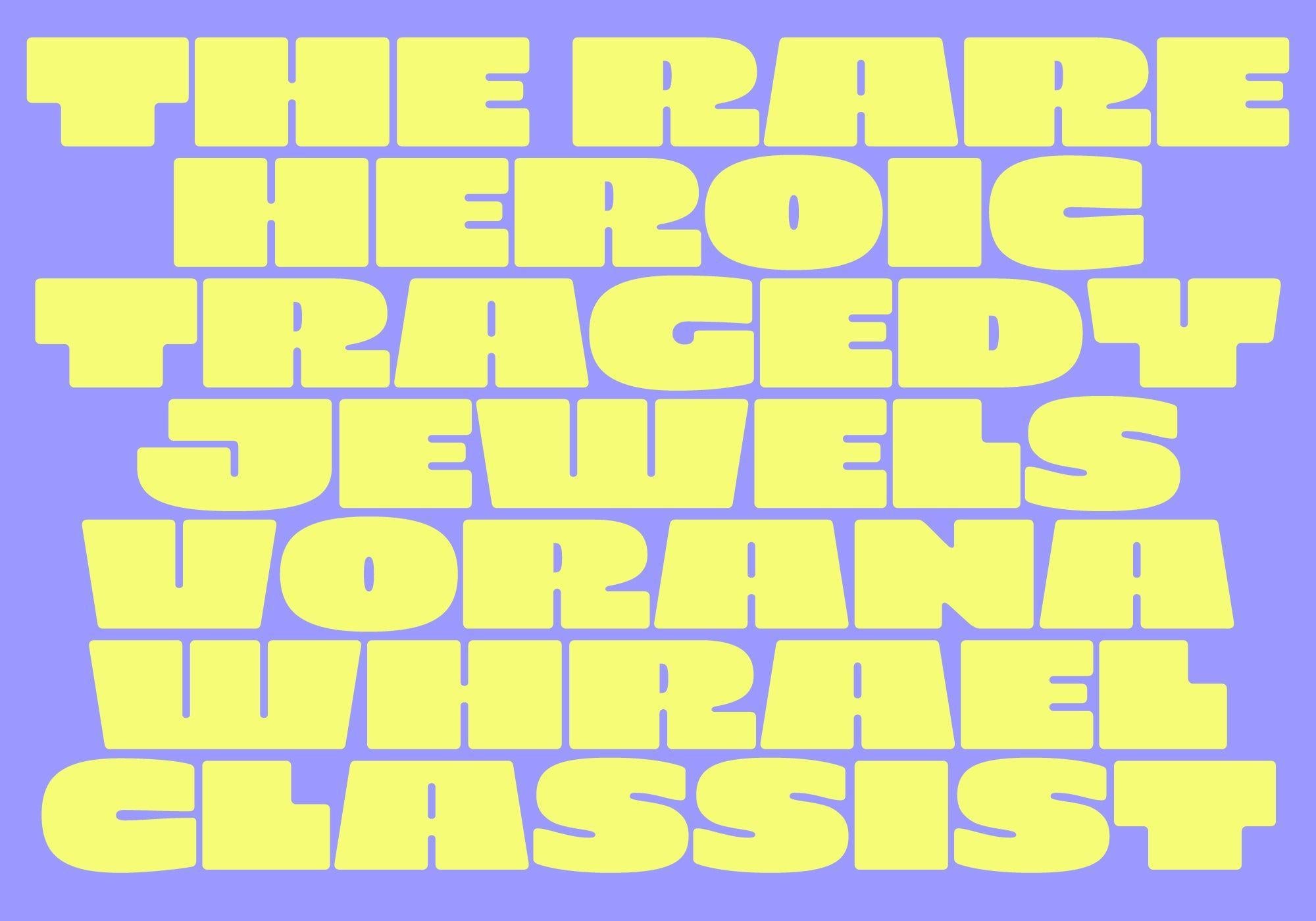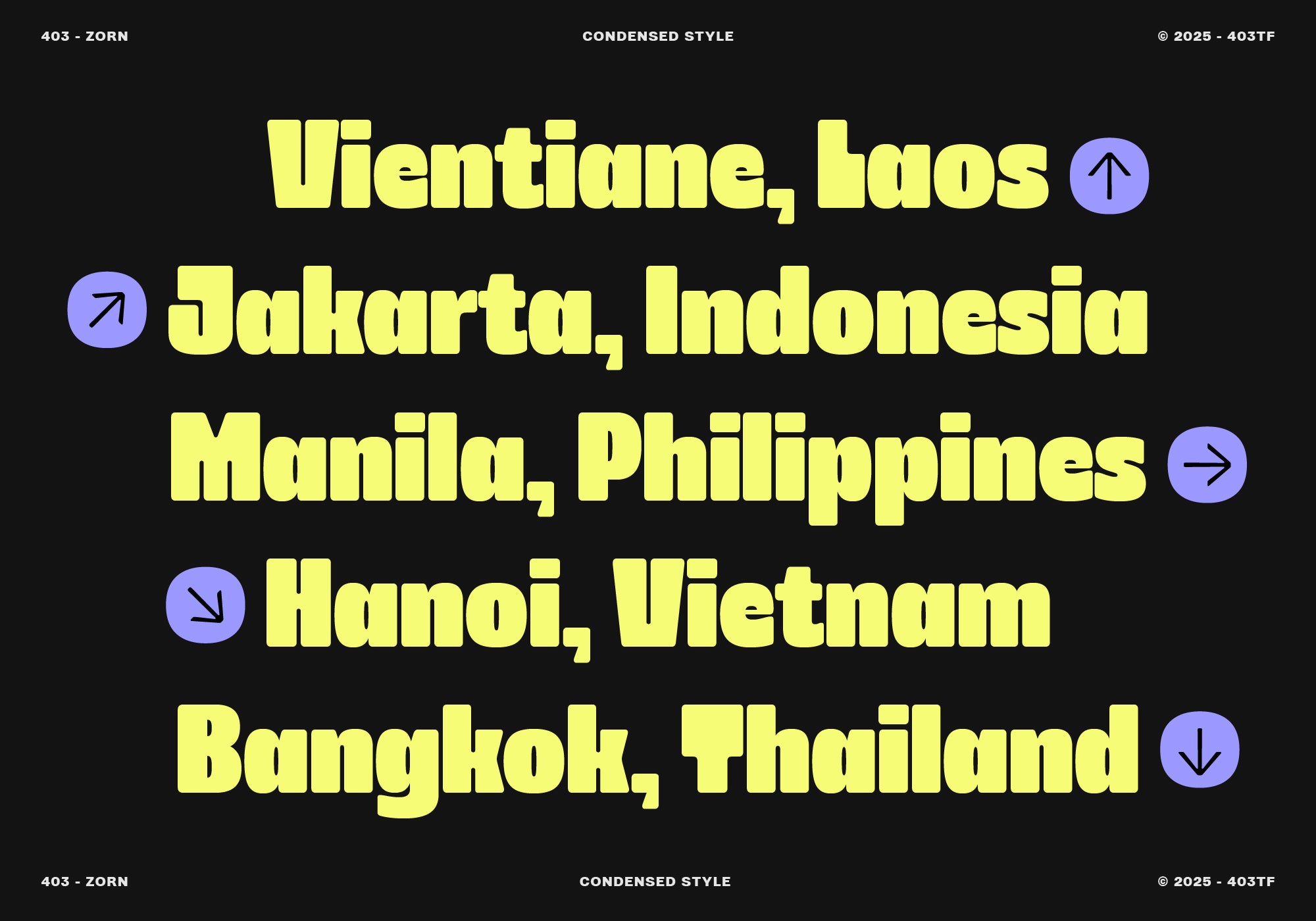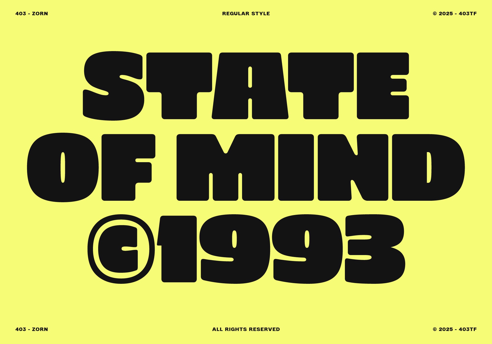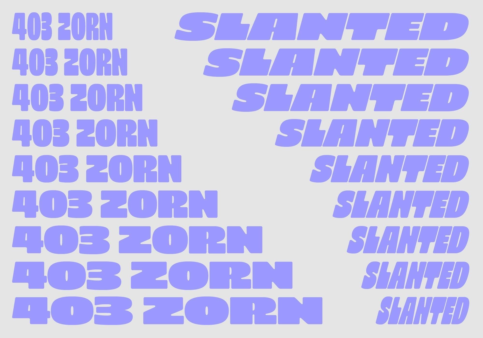 403 Zorn is a bold and flexible display typeface featuring 18 styles, including regular and slanted options. Its geometric, block-style letters with rounded corners provide a strong visual impact, making it suitable for various design projects, including posters and branding.