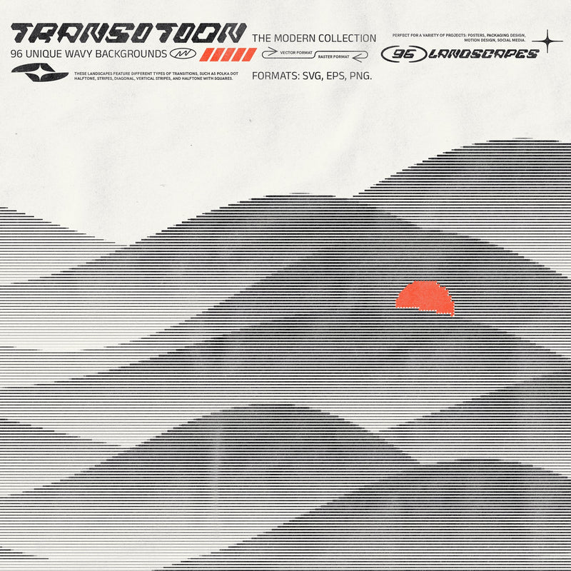 The 96 Wavy Transition Landscapes is a modern collection of black and white transition backgrounds in both vector and raster formats. It includes various transition types like polka dot halftone, stripes, and squares, and comes with bonus paper textures. The collection is compatible with Illustrator, Photoshop, Affinity Designer, and more, and is available in PNG, JPG, EPS, and SVG formats.