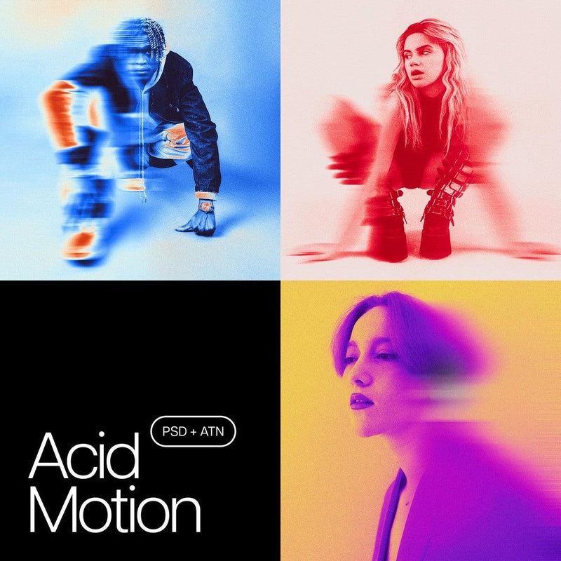 The Acid Motion Photoshop Kit is a comprehensive set of photo effects and a Photoshop action. It includes three high-quality PSD files, an editable blur option, 52 gradients, and a help file, all designed to work individually or in combination. The kit offers a range of vibrant and saturated colors for creating diverse projects, with a resolution of 4000x4000 px and 300 dpi. Compatible with Photoshop.