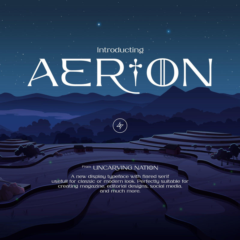 Aerion is a flared serif display typeface that offers a classic or modern aesthetic. It features three weights, both lowercase and uppercase letters, alternates and ligatures, numerals and punctuation, accented characters, and is available in TTF, OTF, and WOFF formats.