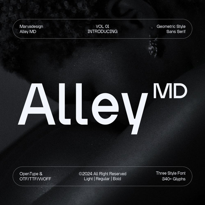 Alley MD is a meticulously crafted sans serif font characterized by geometric precision and clean lines, featuring subtle box strokes at the terminals of some characters for added uniqueness. It offers versatile weights, including Light, Regular, and Bold, making it suitable for a variety of design applications.