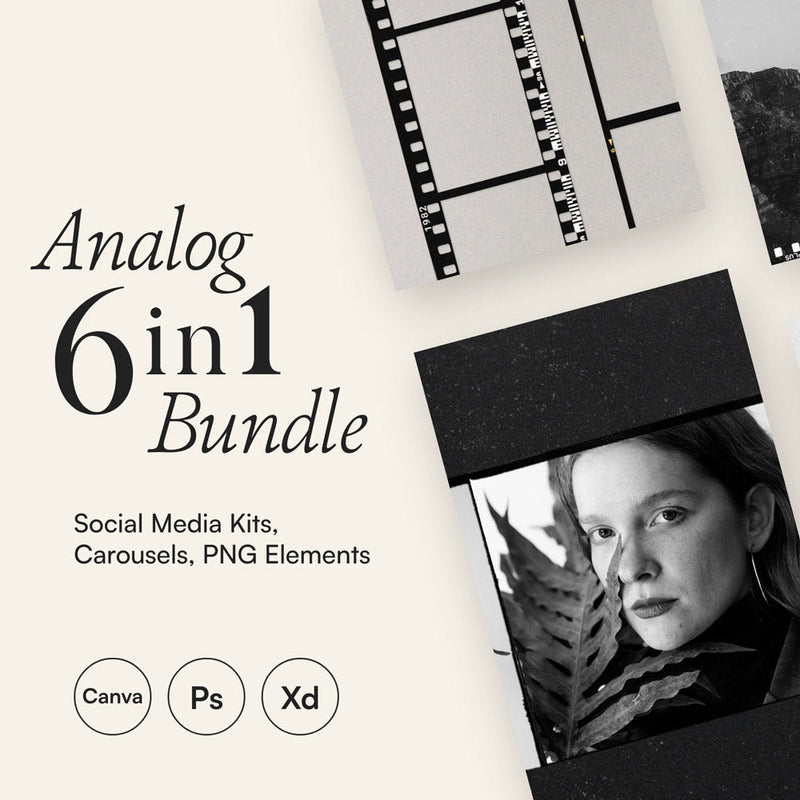 The Analog BUNDLE Elements & Templates is a comprehensive collection of digitized analog materials, including various film and instant camera films. It offers customizable fonts and colors for consistency with your brand or social pages and is compatible with Photoshop, Canva, and Affinity Designer. This bundle includes six products: High-Quality Film Frames Kit, Black and White Film Frames Templates, Analog Film & Instant Social Kit, Analog - Carousel Post Templates, Paper and Film Social Kit, and Gradient High Quality Film Frames.