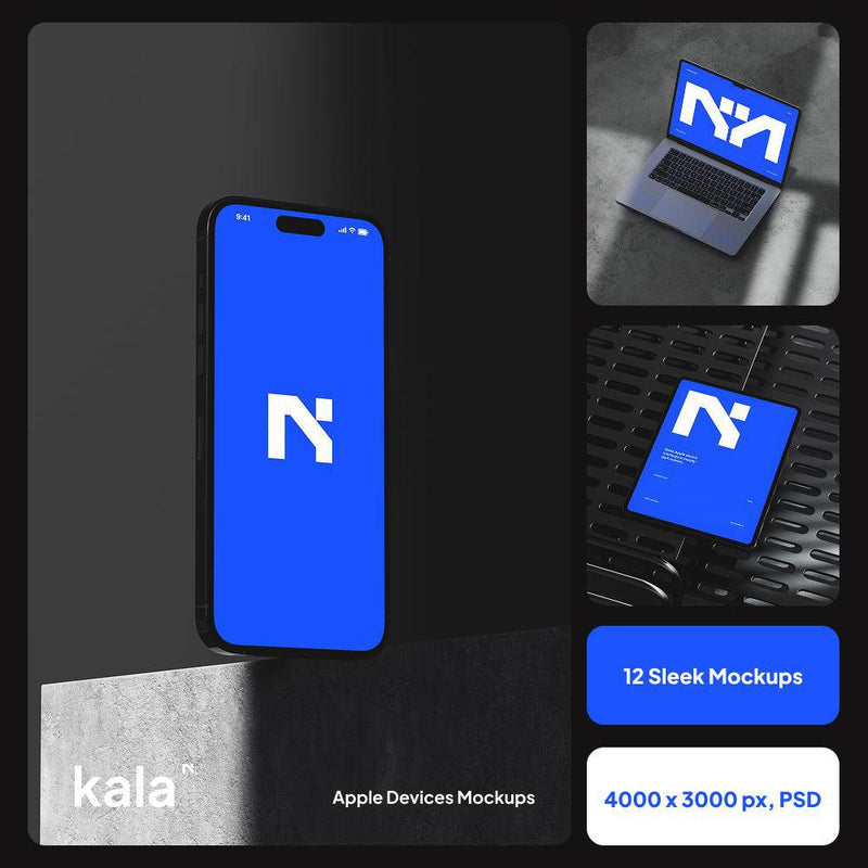 The Apple Devices Mockups Kala is a collection of 12 high-resolution, realistic Apple device mockups set in a dark environment. Compatible with Photoshop, it features fully editable PSD files with smart object layers, making it suitable for UI/UX and branding presentations.