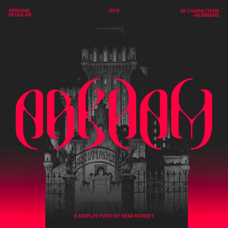 Arkham is a gothic display typeface characterized by its strong ornate features. It is particularly suitable for apparel designs and dark themed logos.