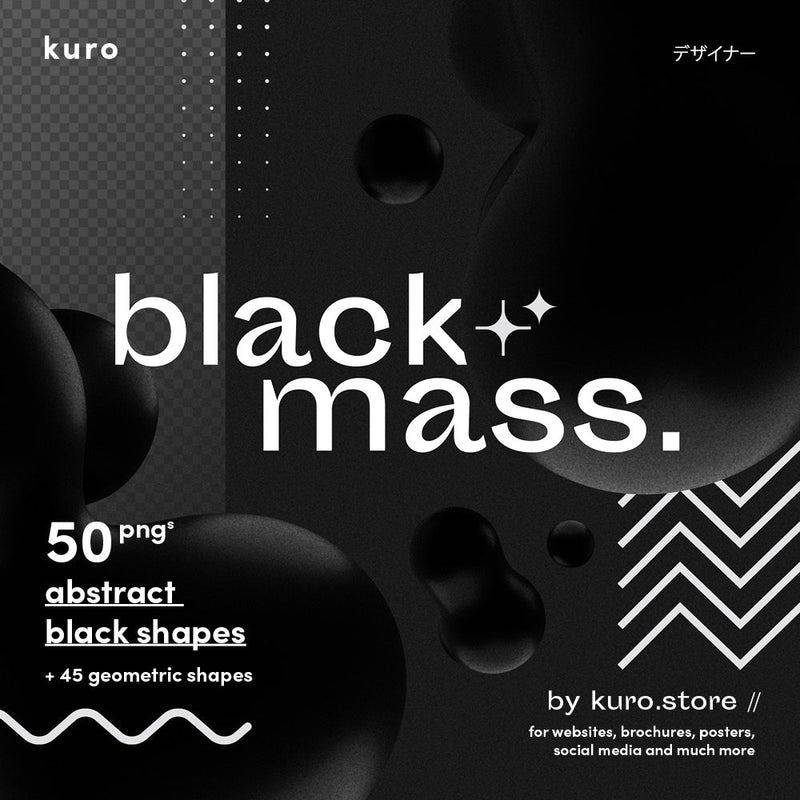 Black Mass is a collection of 95 PNG and vector files featuring abstract black and geometric shapes, ideal for modern design projects. Compatible with various graphic software like Photoshop, Illustrator, Affinity Designer, and Canva, it includes 50 abstract black shapes and 45 geometric shapes, but does not include fonts and templates.