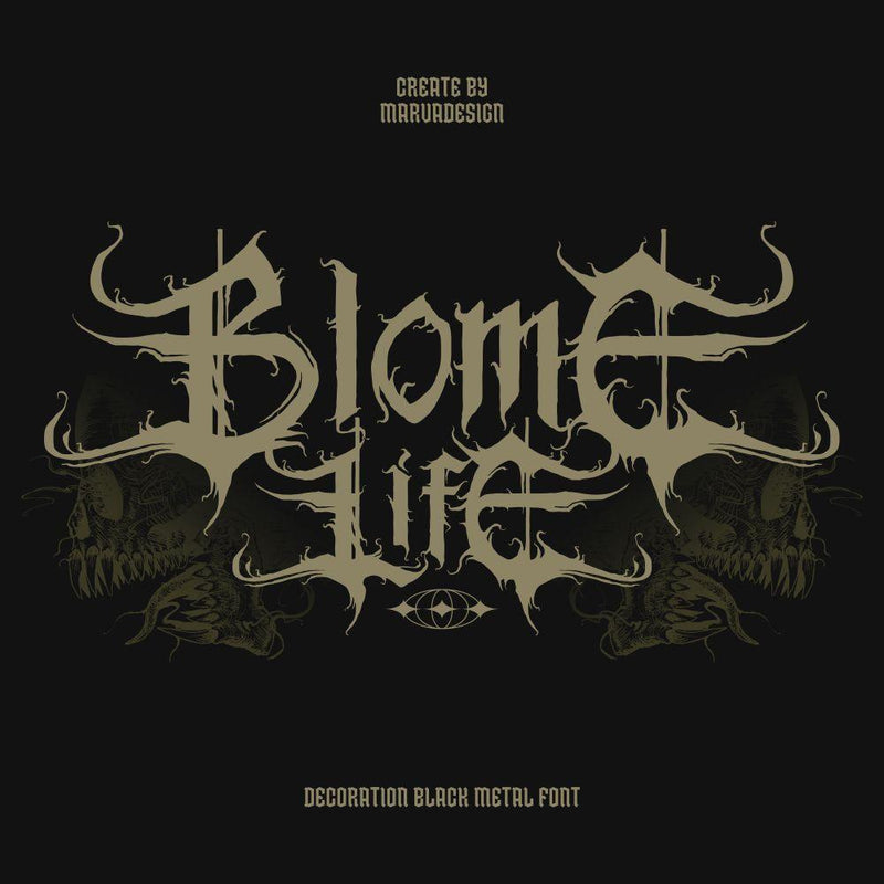 Blome Life is a decorative typeface inspired by black metal aesthetics, featuring intricate details and gothic flourishes. Its uppercase letters showcase a fiery effect, providing a dynamic appearance, while the overall design balances aggressive curves with artistic elements, suitable for a variety of creative projects.