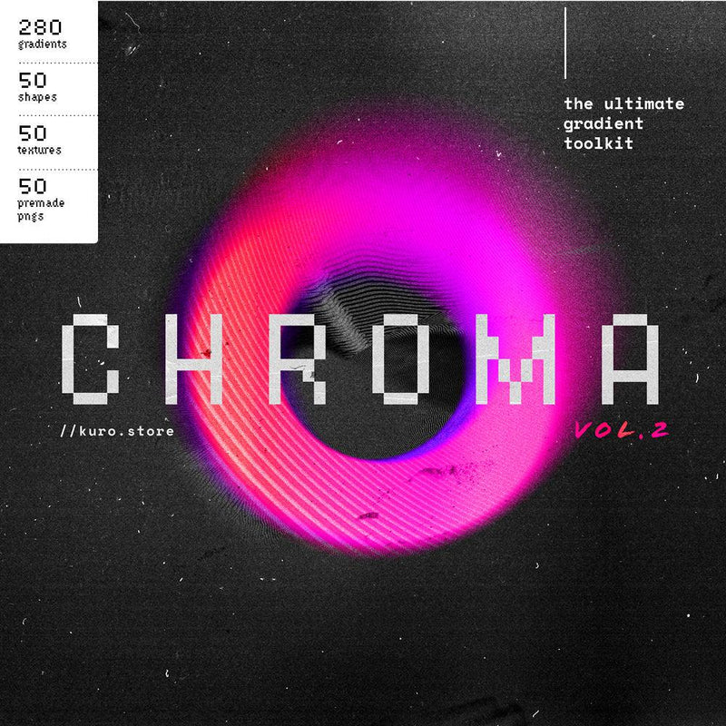 Chroma Grainy Gradient Textures Vol. 2 is a comprehensive collection of editable Photoshop templates, gradients, shapes, and textures. It includes 4 PSD files, 280 individual gradient images, 50 abstract shapes and textures, and 50 premade gradient shapes, all of high-resolution quality. The product is compatible with Photoshop, Affinity Photo, Procreate, and Canva.