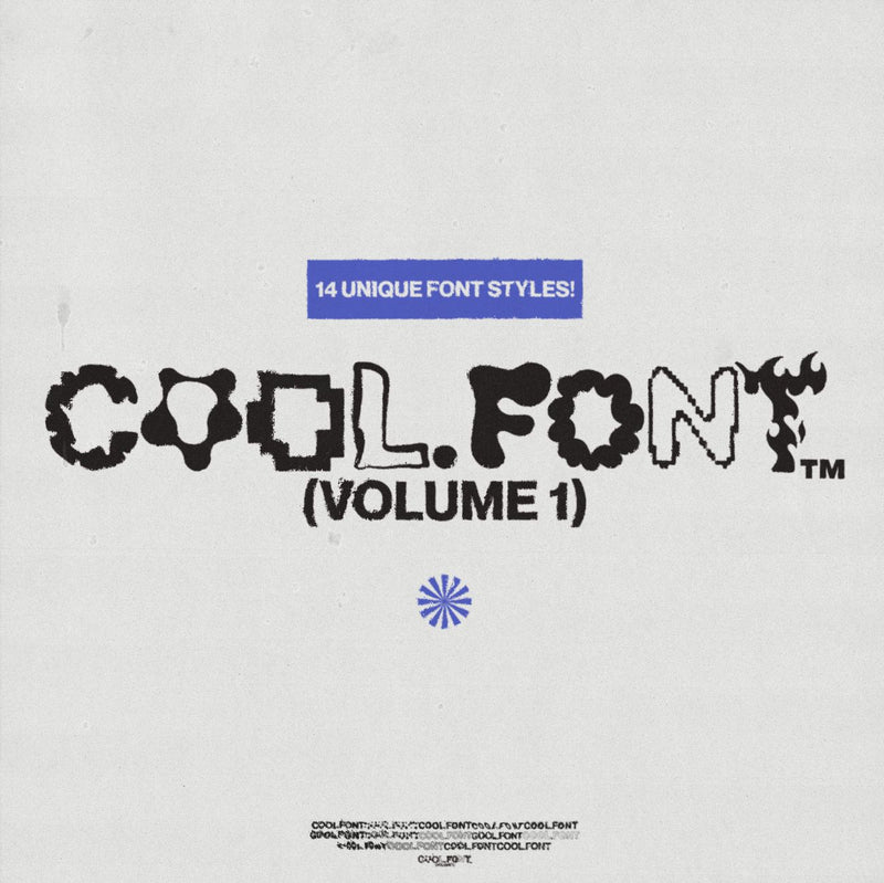 Cool Font (Vol. 1) is a collection of 14 unique .otf font styles, including BALL, CLOUD, DISTORTED, FIRE, FLUID, GOOP, PIXEL, PIX - OUTLINED, SIMPLIFIED, REGULAR(ISH), ROUGH - OUTLINED, TRIPPY, and STRUCTURED. Each style is distinct yet complementary, suitable for various design needs. Compatibility details are not specified.
