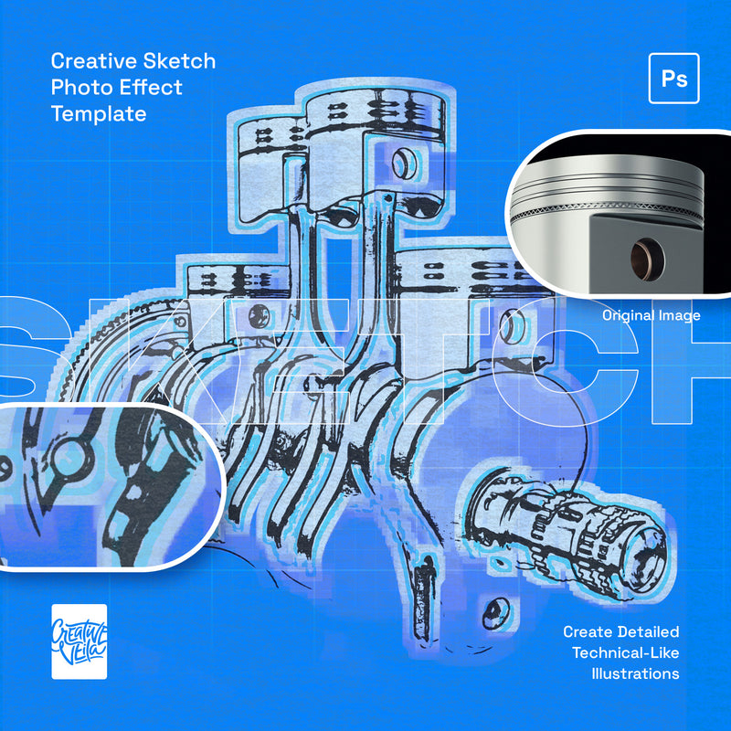 The Creative Sketch Photo Effect for Adobe Photoshop allows users to convert any photo into a hand-drawn composition with a realistic sketch appearance, featuring a marker-style outline and artistic base fill. It includes a well-organized, color-coded PSD file, high-resolution 300 DPI output, a canvas size of 4500x3000px, adjustable background color, and a bonus grid texture.