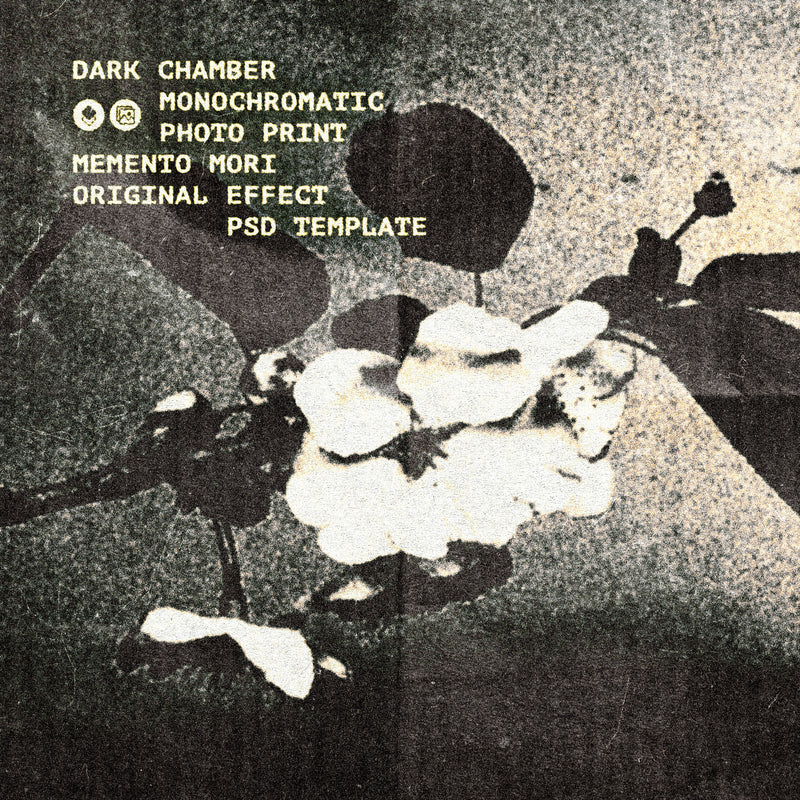 The Dark Chamber Photo Print includes two high-quality PSD files (4500x3000 px and 3000x4500 px, both at 300 dpi) designed for quick edits and layered control in Photoshop. It features a Smart Object for easy image replacement and built-in adjustment layers for focused editing, along with a help file for user guidance.