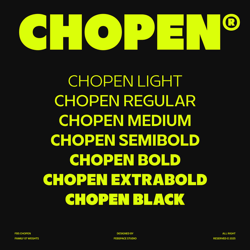 FBS Chopen is a geometric sans-serif font family that combines retro 80's aesthetics with a modern minimalist design. It includes seven weights and over 431 glyphs, featuring OpenType capabilities and multilingual support, making it suitable for a variety of digital and branding applications.