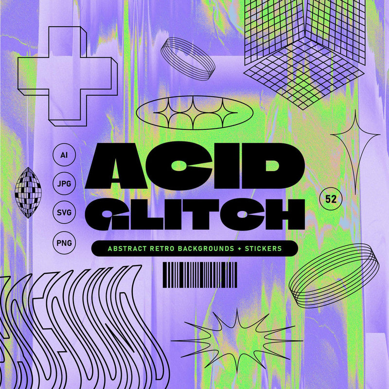 The Futuristic Holographic Texture Set is a collection of digital assets featuring holographic, acid colours. It includes 20 glitched scanned textures, 16 glitched objects on transparent backgrounds, and a bonus of 23 vector frames and decorations. The set is compatible with various design platforms including Illustrator, Photoshop, Affinity Designer, Affinity Photo, Procreate, Sketch, Figma, and Canva.
