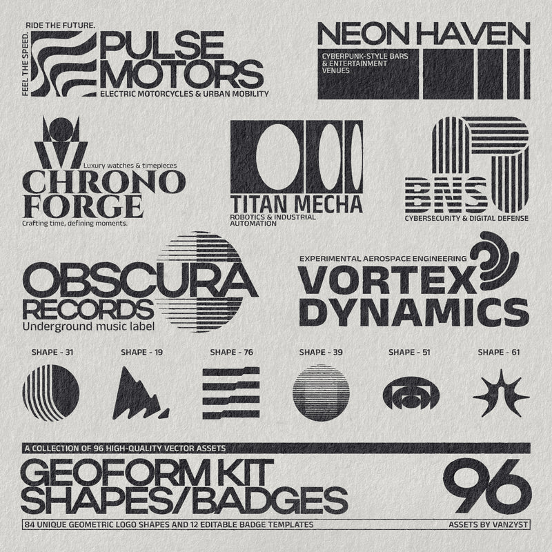 The GeoForm Kit includes 96 high-quality vector assets, featuring 84 unique geometric logo shapes and 12 editable badge templates with customizable text. It provides various file formats (AI, EPS, SVG, PNG, JPG, PDF) compatible with multiple graphic design software, along with a PDF file listing free-for-commercial-use fonts.