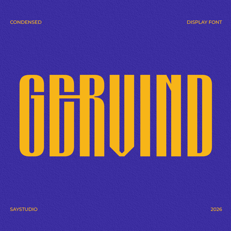 Gervind is a bold condensed display typeface designed for high-impact typography, featuring tall proportions, strong structure, and clean geometry. It includes Gervind Regular and Italic in OTF, TTF, and WOFF formats, with support for uppercase, lowercase, ligatures, alternates, symbols, numbers, and multilingual characters.