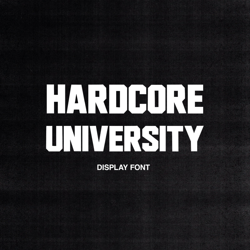 HARDC0RE_UNIVERSITY DISPLAY FONT is a bold, varsity-inspired typeface featuring all caps and numbers, available in one weight for full impact. It is provided in .OTF and .TTF formats, suitable for both print and digital design.