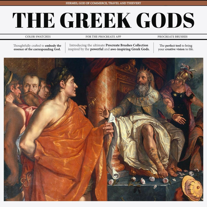 The Hermes Procreate Kit, part of The Greek Gods Collection, includes 300 color swatches, 11 Procreate brushes, and 8 paper textures, all inspired by Hermes, the God of commerce, travel, and thievery. This kit is compatible with the Procreate app on iPad and requires an Apple Pencil for use.