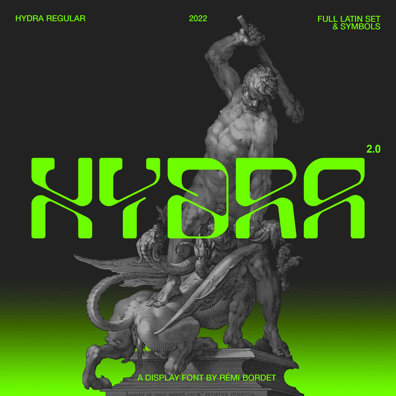 Hydra 2.0 is a dominant and expressive display font featuring soft rounded edges for a unique aesthetic. It is compatible with a variety of design platforms including Photoshop, Illustrator, After Effects, Lightroom, Affinity Designer, Affinity Photo, Indesign, Procreate, Figma, Canva, and Sketch.