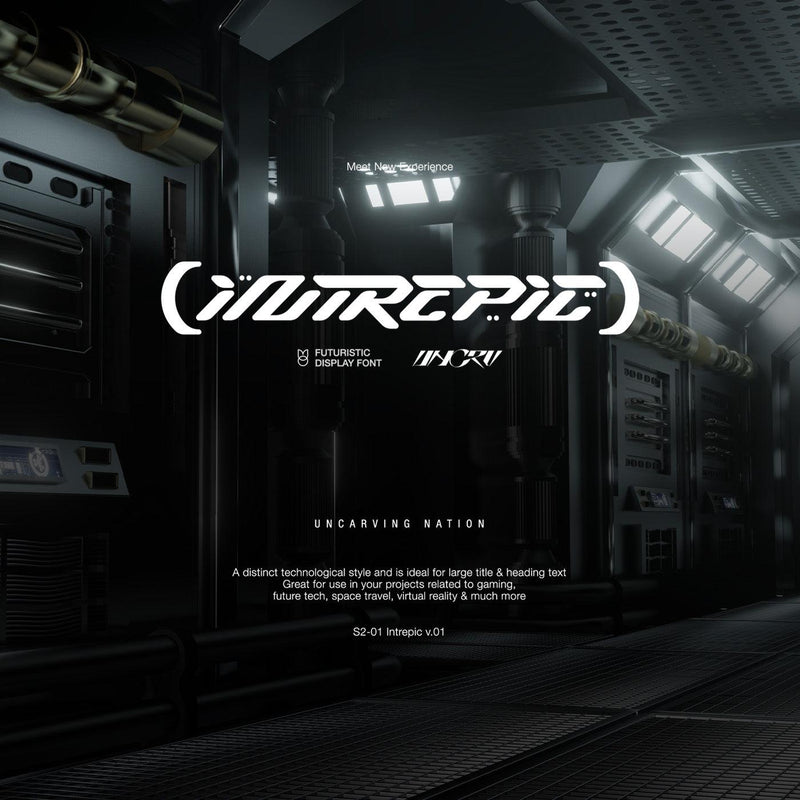 Intrepic is a unique, modern typeface with a bold theme and italic touch, ideal for projects related to gaming, future tech, space travel, and virtual reality. It features a simple yet distinctive design, suitable for apparel, display, poster, and is categorized under Y2K and Cyberpunk fonts.