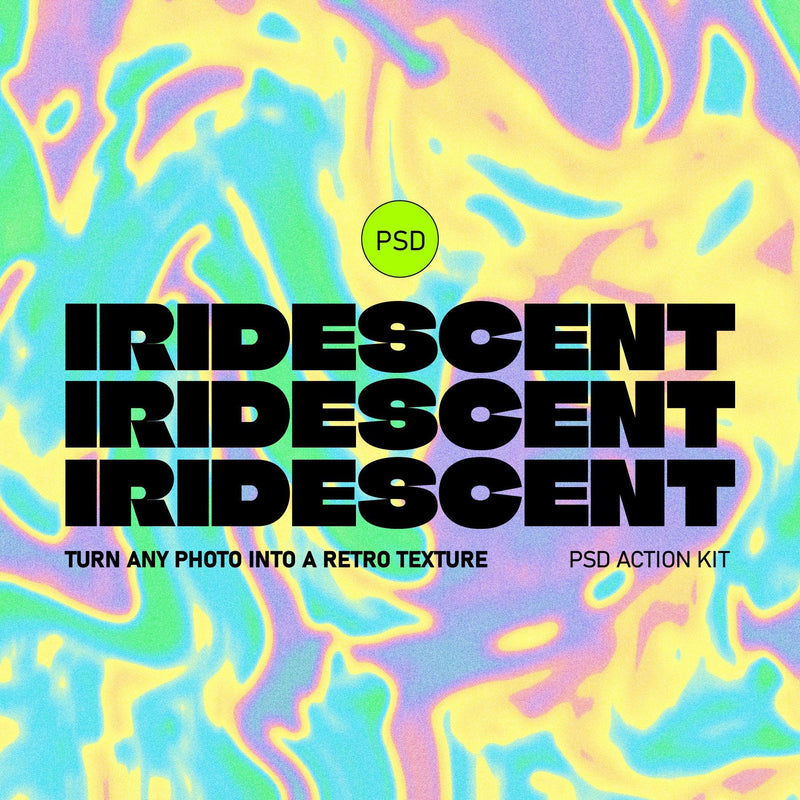 The Iridescent Texture Action Kit is a Photoshop-compatible product that includes a Photoshop Action file with 12 actions, a PSD kit for texture production, and an instructions file PDF. It allows users to input any photo and convert it into a grainy, iridescent texture with varying results.