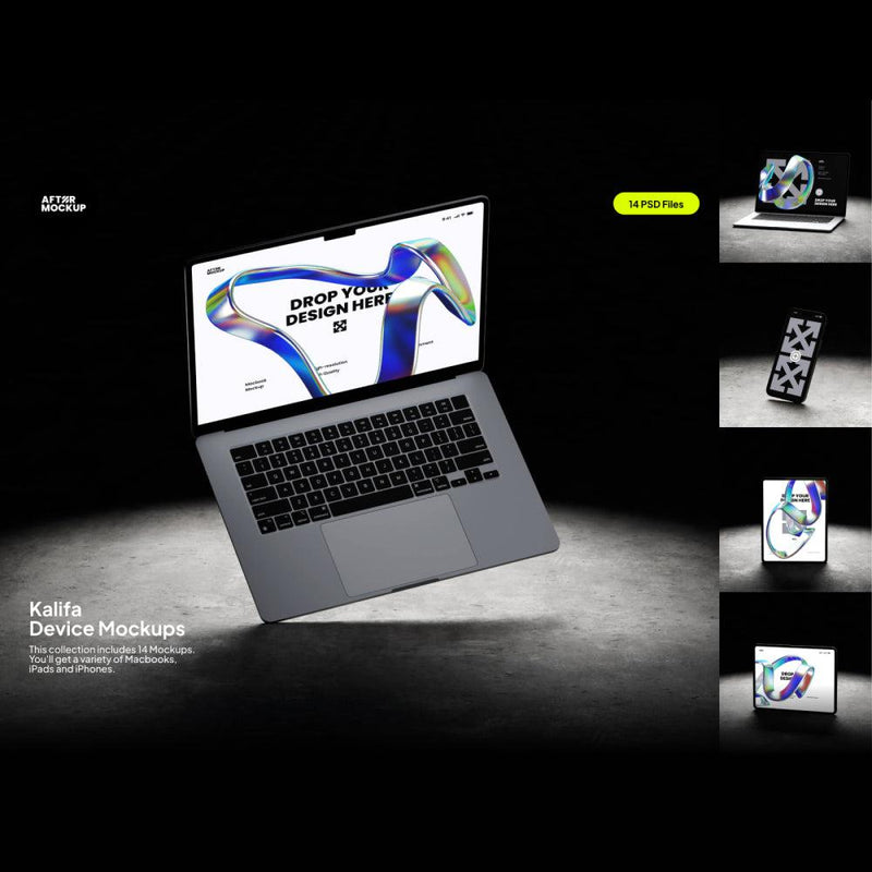 The Kalifa Device Mockups is a collection of 14 high-resolution (6000x4500px) mockups featuring a variety of Macbooks, iPads, and iPhones. Delivered in layered PSD files for easy customization, this product is compatible with Photoshop and offers unique environments for displaying UI, website, or app presentations.