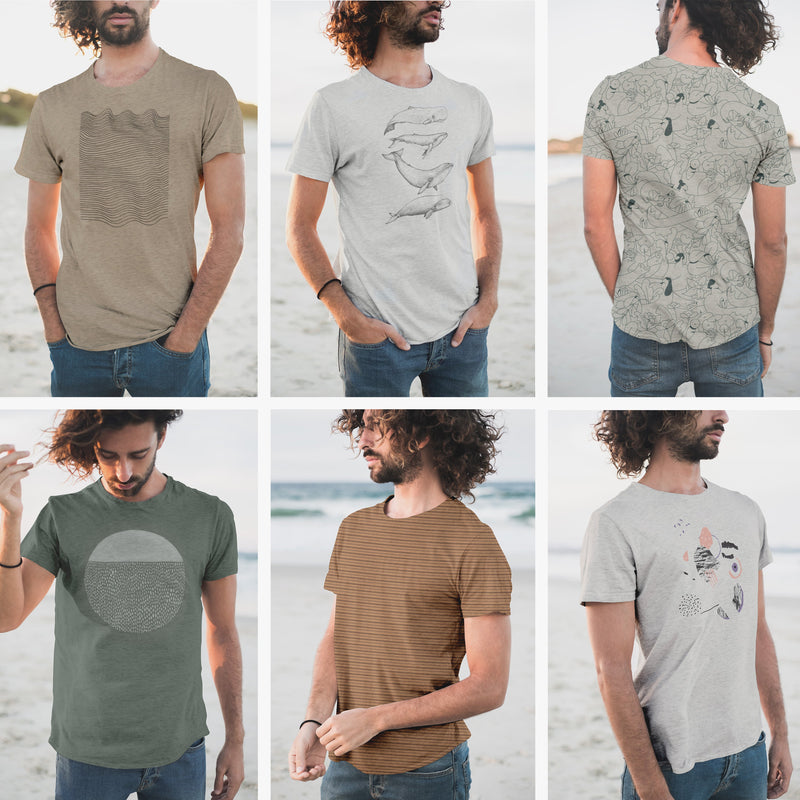 The Male Ocean T-Shirt Mockup is a graphic resource that allows users to apply their designs to 6 different t-shirts modeled in an oceanside setting. It features easy editing through smart object layers, 300 dpi resolution, and customizable colors. The mockups are compatible with Photoshop and Affinity Designer.
