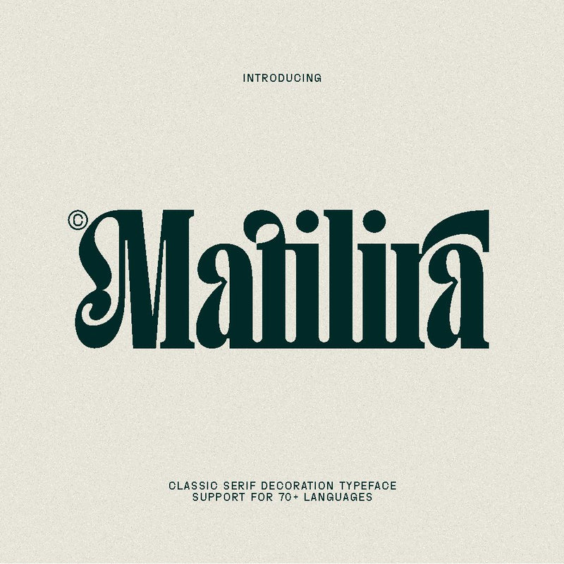 Matilira is a decorative serif typeface characterized by its bold structure, strong vertical strokes, and unique ligatures. With elegant curves and ornamental details, it offers a blend of vintage charm and modern boldness, making it suitable for a variety of design applications.