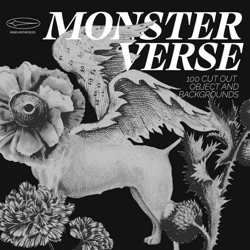 The MONSTERVERSE Collage Set is a collection of horror-inspired, black and white textured graphics, featuring a variety of elements like animals, keys, and busts. The set includes 90 textured elements in PNG format and 10 abstract landscape backgrounds in JPG format, compatible with Photoshop, Affinity Photo, Procreate, and Canva.