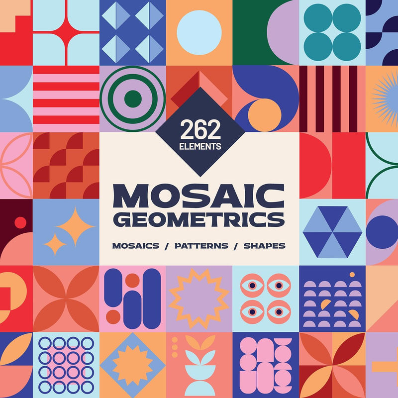 Mosaic Geometrics is a stock art collection featuring 262 high-quality geometric mosaics, patterns, and shapes. It is compatible with various design platforms such as Illustrator, Photoshop, Affinity Designer, and more, and includes file formats like jpg, png, svg, and ai.