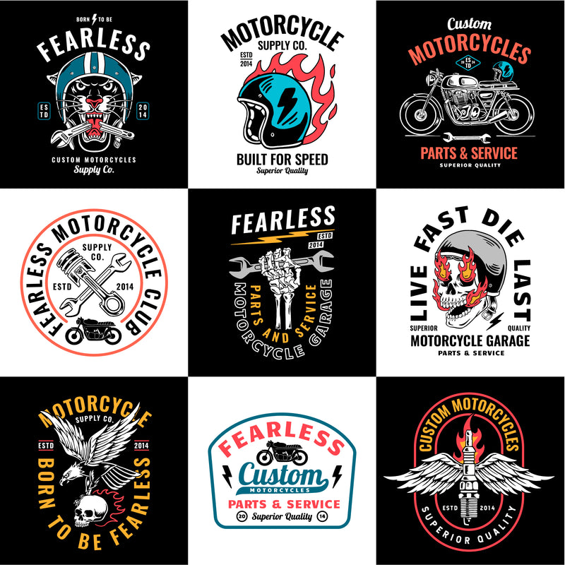 The Motorcycle Design Collection includes 9 customizable designs suitable for t-shirt prints, posters, or mugs, featuring editable text and colors. It provides all-in-one and separate vector files in AI and EPS formats, along with 300 dpi PSD, JPEG, and PNG files, all organized for easy use and scalability without loss of resolution.
