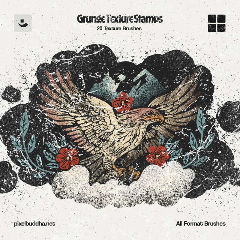 The Multi-App Grunge Stamp Brushes set includes 20 brushes designed to create various textures such as scratches, paint cracks, and speckles. These brushes are compatible with Adobe Photoshop, Adobe Illustrator (CS6 version included), Procreate, and Affinity Designer, allowing for versatile application across different platforms.