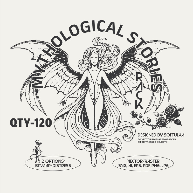 The Mythological Stories Vector Pack is a collection of 120 design assets, including pixelated and distressed textured objects featuring a range of mystical and gothic-themed elements. The pack, compatible with various design software like Photoshop, Illustrator, and Procreate, offers fully scalable and editable elements in both vector and raster formats.