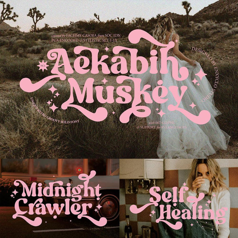 The NCL Aekabih Muskey is a retro groovy bold font that is designed for use in both large and small point sizes. It features a variety of formats including True Type Font (TTF), Open Type Font (OTF), and Web Open Format (WOFF1 & WOFF2), and contains 667 glyphs, uppercase and lowercase letters, numerals, punctuation, symbols, special ligatures, and stylistic sets. It supports 85 languages, making it a versatile